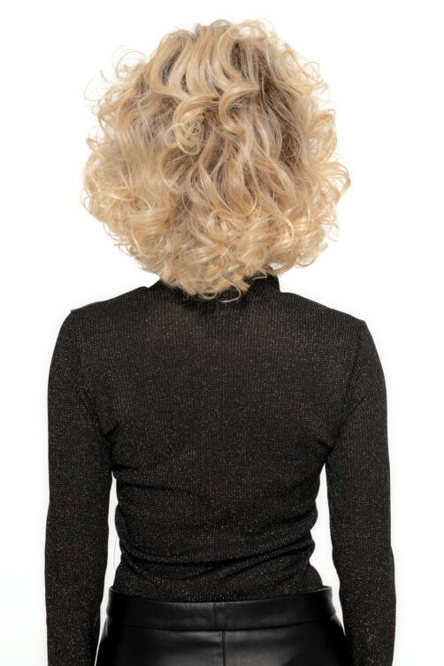 All over voluptuous bouncy S curls frame the face or brush back behind the ears and fall gently below the collar.