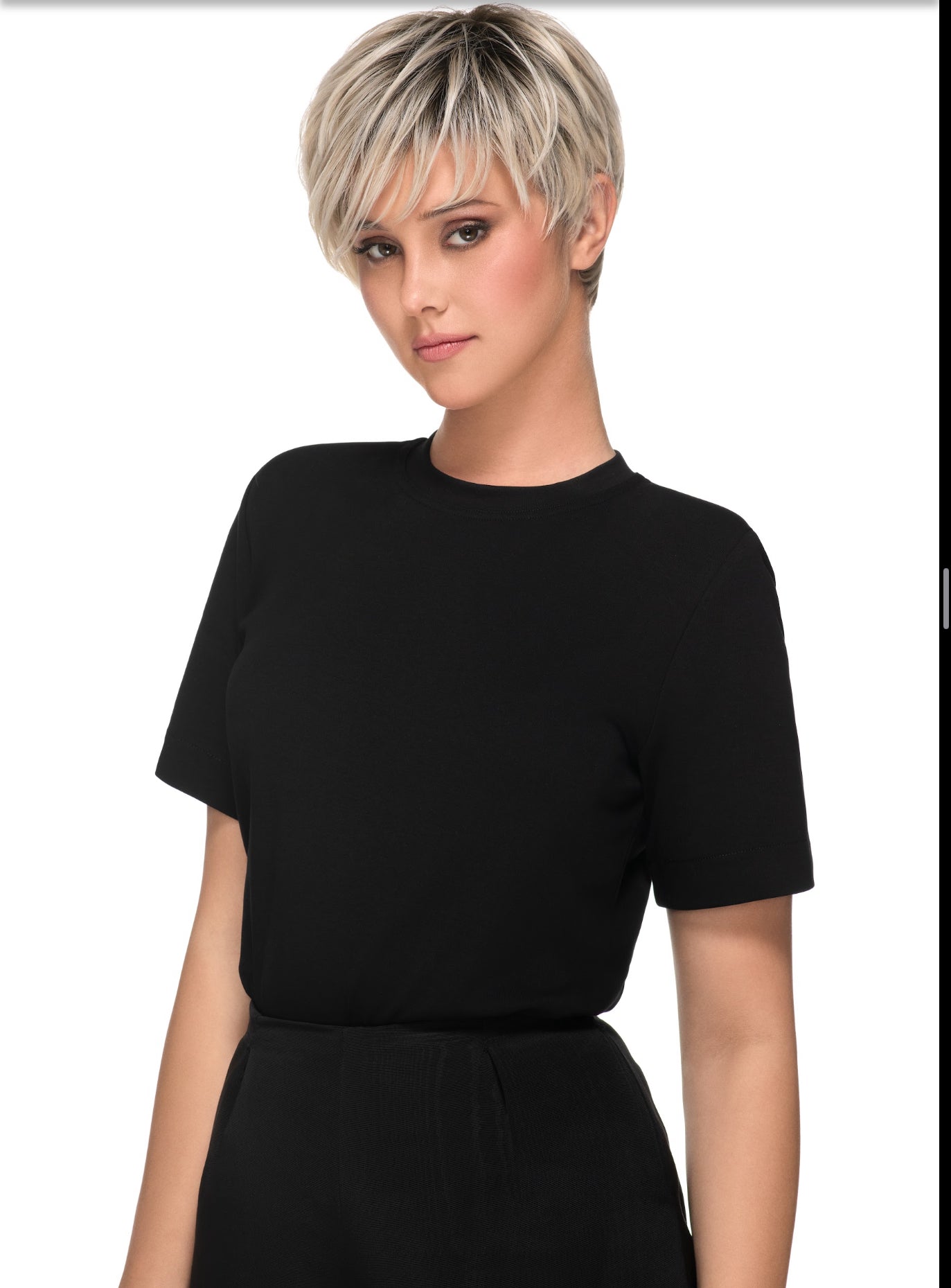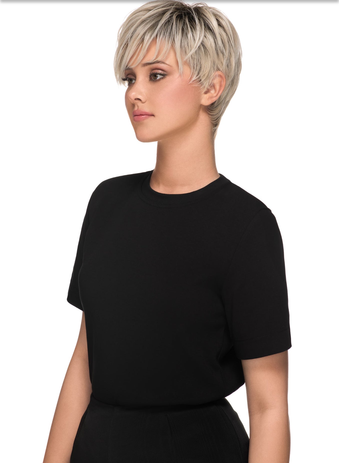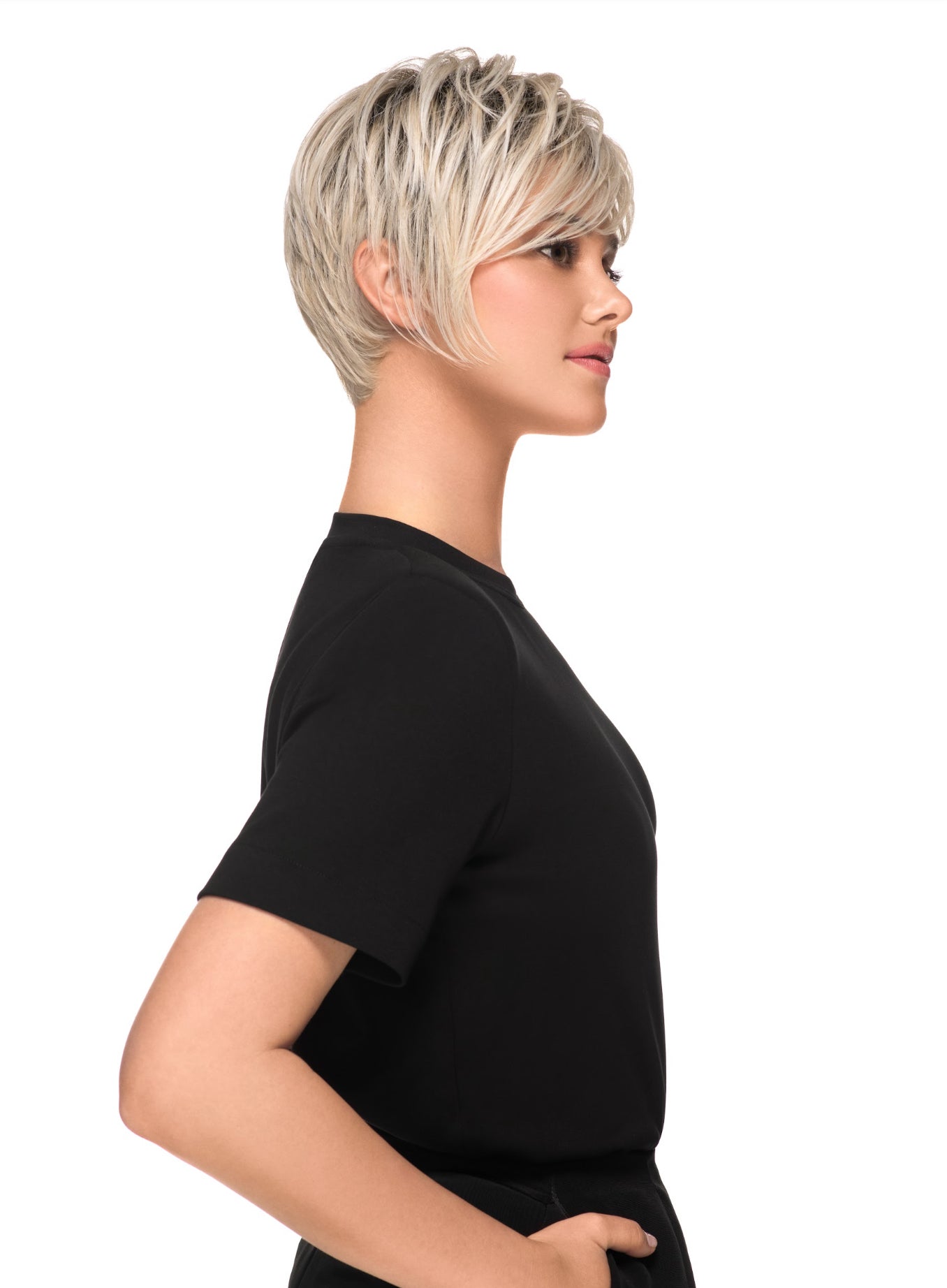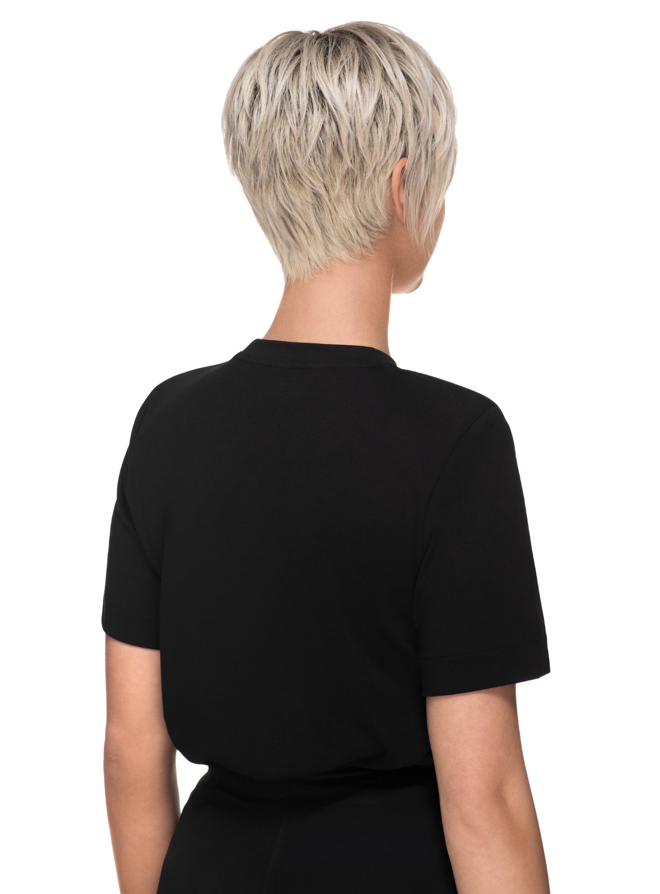 A silky straight low density asymmetric pixie shag that tapers at the nape. Special pre-teased roots provide lift without any of the bulk or fizziness. Long enough to brush over or behind your ears and adjustable ear tabs for just the right fit.